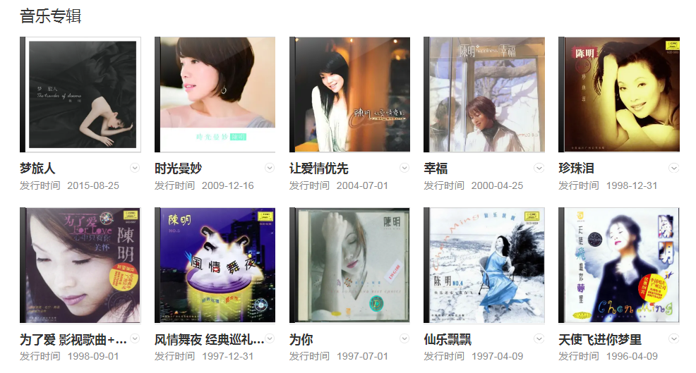 自九十年代初步入歌壇,陳明作為國(guó)內(nèi)的第一批簽約歌手,在親歷了中國(guó)原創(chuàng)流行音樂(lè)的數(shù)載沉浮后,至今仍是音樂(lè)界活躍的實(shí)力派歌手之一。無(wú)論是卡帶盛行的年代,還是網(wǎng)絡(luò)下載的今天,她的作品都同時(shí)擁有著傲人的銷量和極高的流行性與傳唱度。