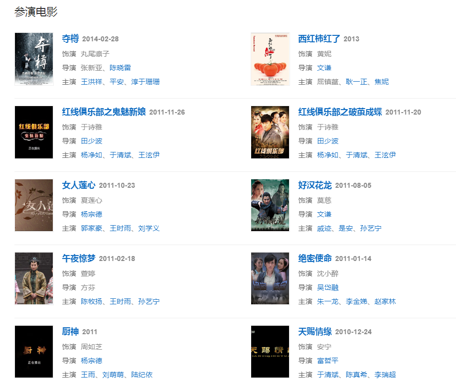 代表作品:大明嬪妃、天師鐘馗、楚漢爭雄、母儀天下粉絲名卿花瓷喜歡書籍《穆斯林的葬禮》、《長恨歌》