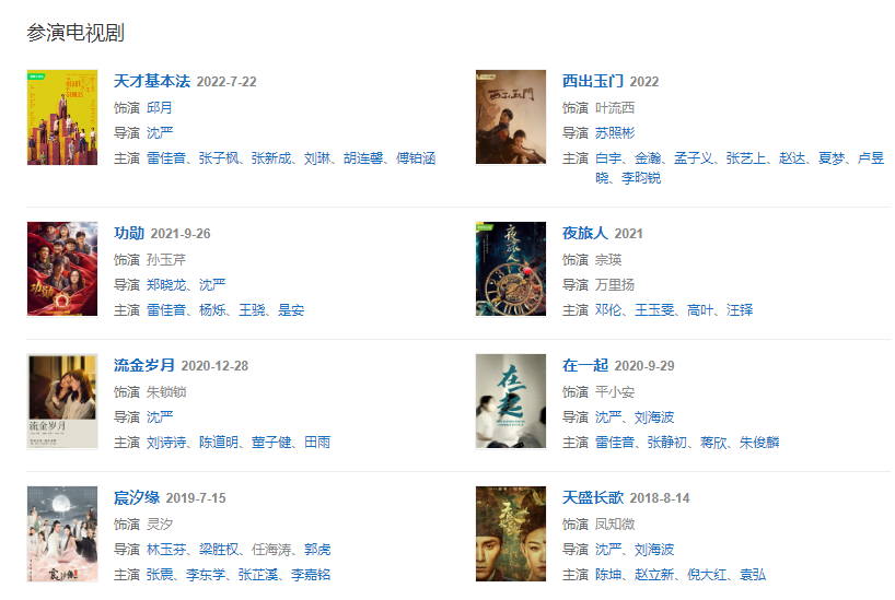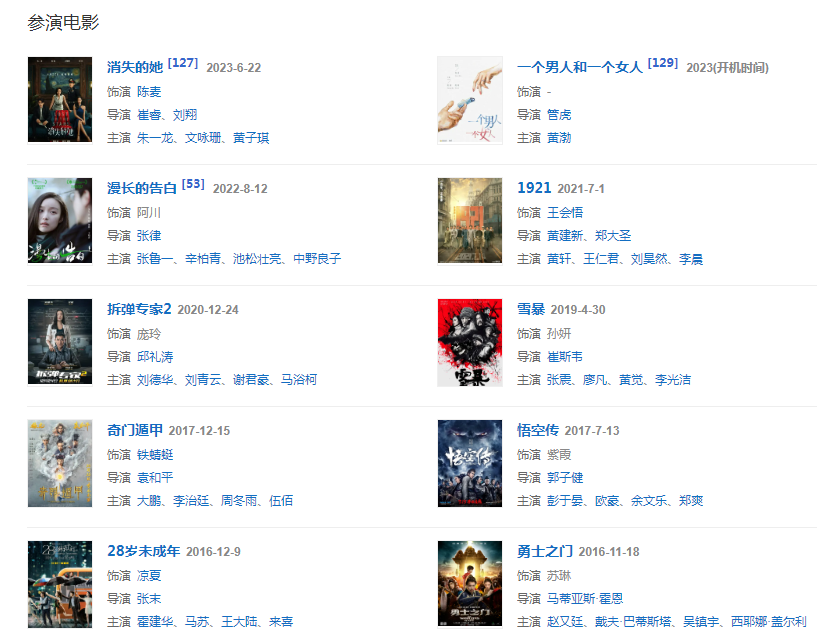 代表作品:金陵十三釵、流金歲月、幺幺洞捌、拆彈專家2、天盛長歌、宸汐緣、匆匆那年