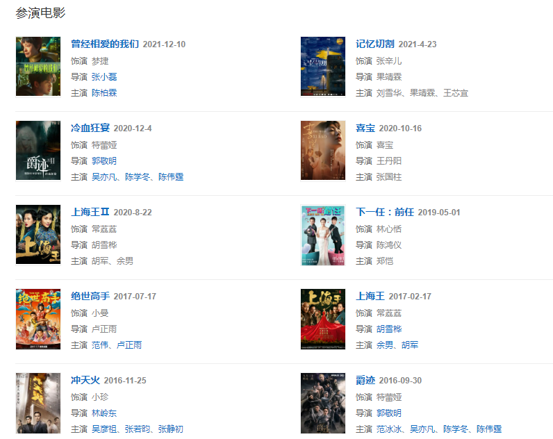 201625日,郭采潔在上映的動作喜劇片《我不做大哥好多年》中飾演了熱情奔放的朱小芹;930日,全真人CG魔幻題材電影《爵跡》上映,郭采潔在片中飾演性感但卻十分殘酷的現(xiàn)任四度王爵特蕾婭;1125日,由林嶺東執(zhí)導(dǎo)的懸疑動作片《沖天火》上映,郭采潔在片中飾演具有藝術(shù)天分的小珍。