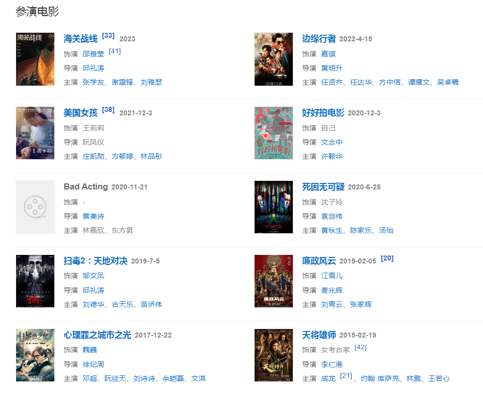202246日,由林嘉欣等主演的電影《海關(guān)戰(zhàn)線》開機。415日,參演的犯罪動作電影《邊緣行者》上映。