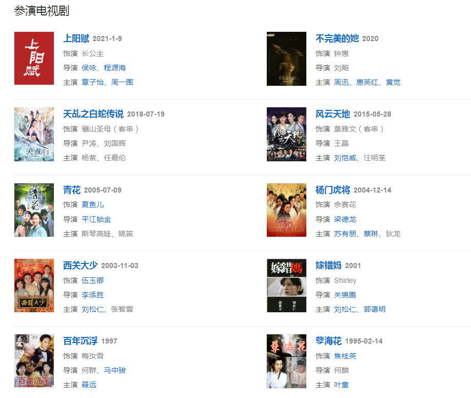 代表作品:新白娘子傳奇、上海灘、戲說乾隆、楚留香、京華煙云、飛鷹、女黑俠木蘭花、觀世音、笑看良緣