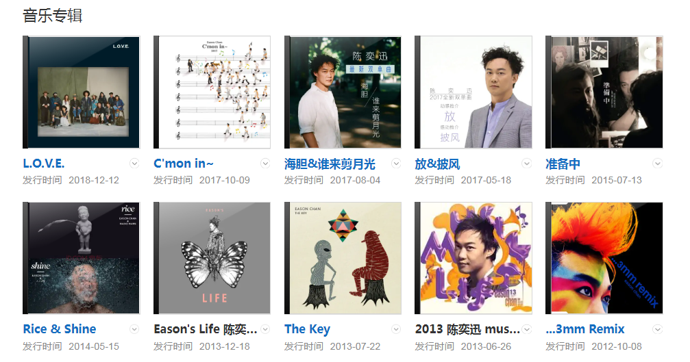 代表作品:我的快樂(lè)時(shí)代、K歌之王、十年、富士山下、好久不見(jiàn)、陰天快樂(lè)、最佳損友、浮夸、與我常在、愛(ài)情轉(zhuǎn)移、你的背包、你給我聽(tīng)好、人來(lái)人往、不要說(shuō)話、單車(chē)、苦瓜、淘汰、可以了、陪你度過(guò)漫長(zhǎng)歲月、我們、孤勇者