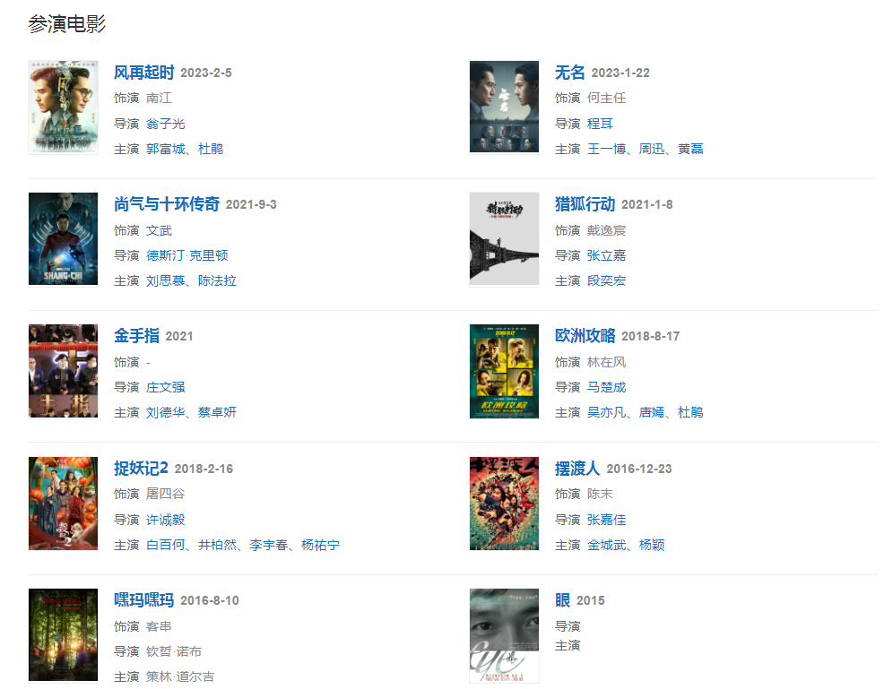 2015年主演的《一代宗師》3D版上映;同年接拍由王家衛(wèi)監(jiān)制的電影《擺渡人》,并獲得法國文化部頒授的“法國藝術(shù)與文學軍官勛章”