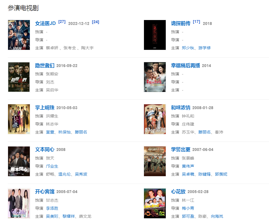 代表作品:刑事偵緝檔案、縱橫四海、壹號(hào)皇庭、掌上明珠、倚天屠龍記